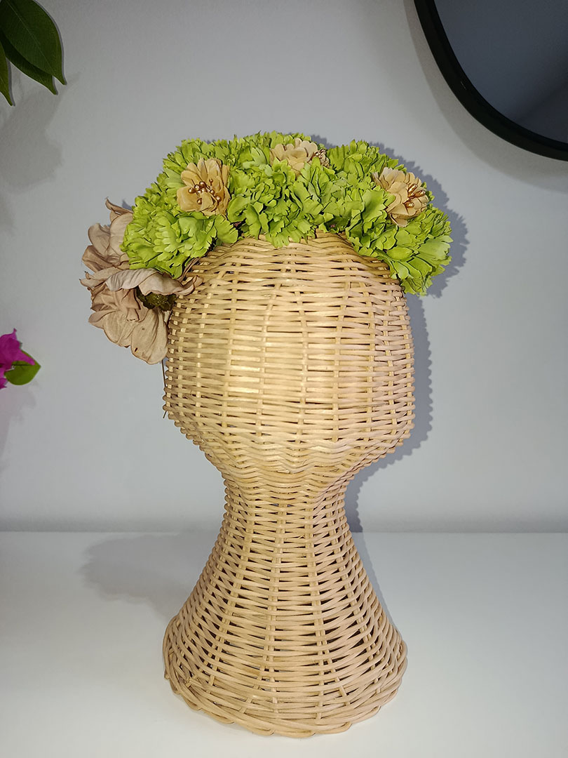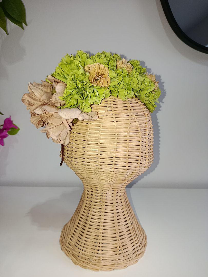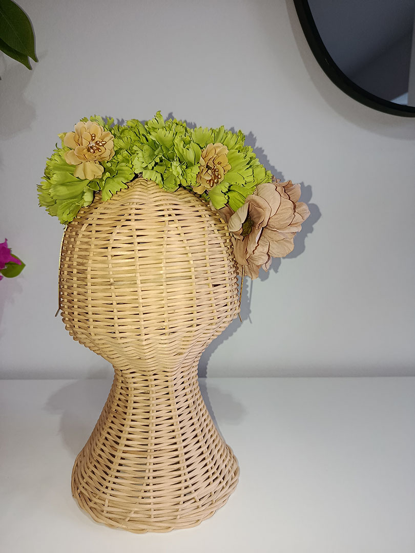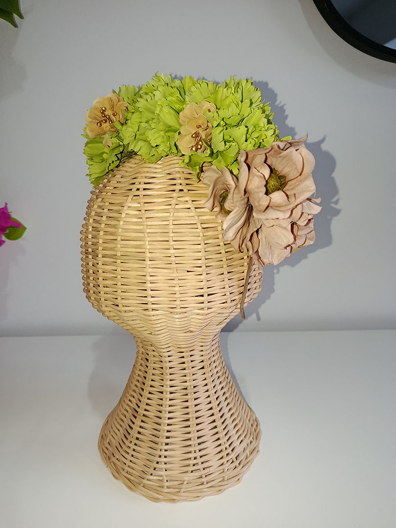 Diadema de flores de flamenca en tonos verdes y camel. Sus flores son claveles, amapolas y florecillas. Ideal para ferias o romerías. No necesita horquillas. Diadema en metal DORADO.