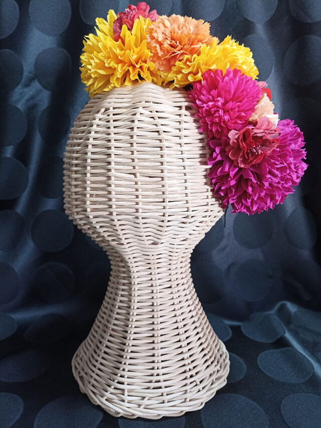 Diadema de flores de flamenca en tonos lilas y morados. Sus flores son crisantemos y florecillas.